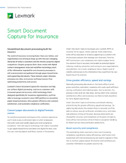 Insurance employees often spend a great deal of time manually processing paperwork, and then correcting the errors associated with keying in data. These processes are expensive, slow--at times requiring multiple days to complete--and keep you from focusing on your customers and completing their requests in a timely and effective manner. Smart Document Capture enables you to eliminate once-manual tasks and reduce redundancies to make processes more digital and productive. By leveraging the Lexmark MFP platform in insurance offices to easily capture documents, you’ll drive greater efficiency and speed, and reduce the cost of document processing.