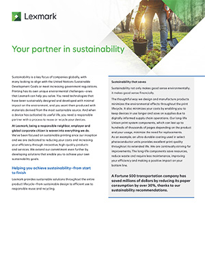 Os dispositivos Lexmark são produzidos com materiais derivados de fontes sustentáveis e projetados para ter um impacto mínimo no meio ambiente durante todo o ciclo de vida da impressão.